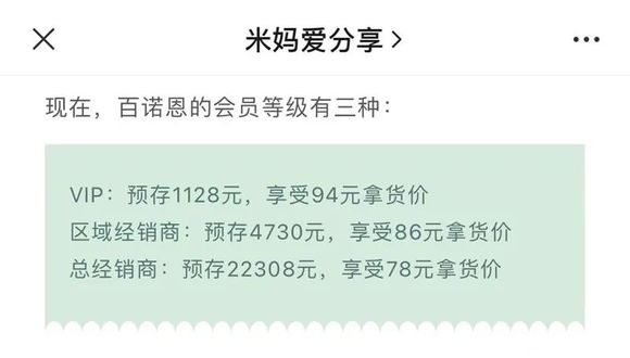 在微信公众账号“米妈爱分享”分享的文章中可以看到,百诺恩采用预存模式为加盟方式,根据不同的预存金额,其拿货价格也就不同,级别越高价格也就越低。