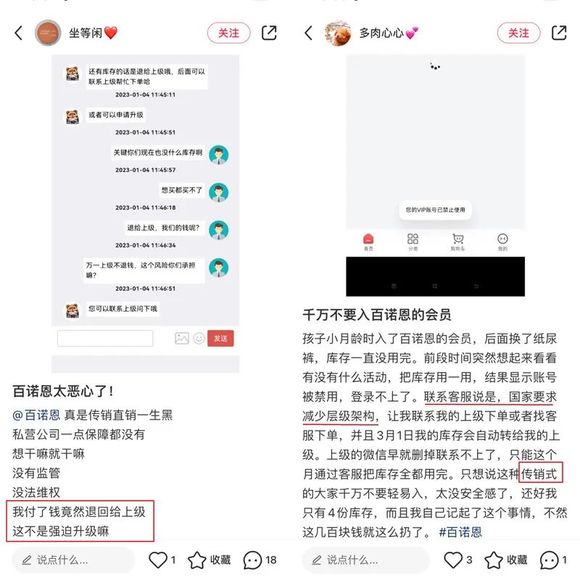 与此同时,百诺恩的会员层级制度在去年8月就已经被执法部门注意,小红书上也有宝妈控诉被百诺恩“坑”的笔记信息,“千万不要入”、“百诺恩太恶心了”,大多都是在告诫网友们不要加入此品牌的会员。