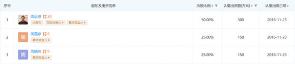 万邦科技于2016年成立,企查查对外投资页面中,也出现了杭州百诺恩享健康科技有限公司的身影,但此公司已注销。公司法人为周文宾,但实际控股人为周运进,拥有50%的股份,周燕婷与周映纯各持股25%。据了解,此三人为万邦集团法人周昭扬的子女。