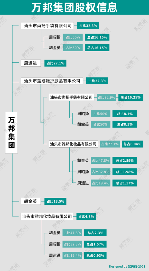 企查查信息显示,万邦集团法人为周昭扬,注册资金3138万元,周昭扬间接持股,最终受益股份为25.9%。而集团第一大股东实际是胡金英,掌握集团40.1%的股份,第二大股东为其子周运进,身为“接班人”,掌握28%的股份。