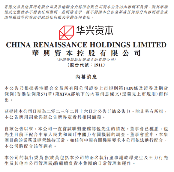 华兴资本表示,该集团目前业务及运营维持正常,日常管理运作由执行董事谢屹璟和王力行负责。
