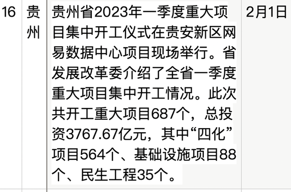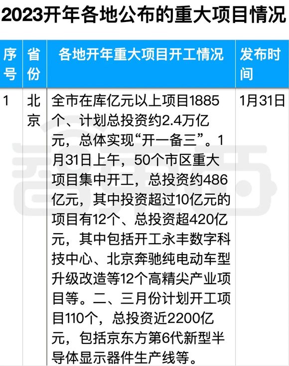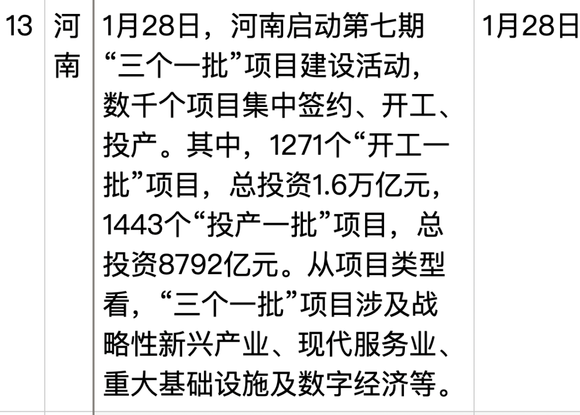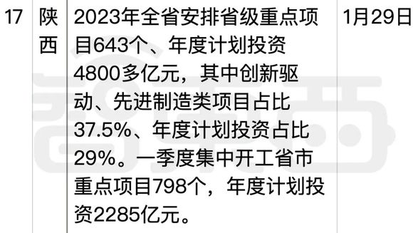 开工第一天,1月28日,广东省21个市的书记立下军令状,广州、深圳随即公布了6800亿元、3295亿元新开工或签约的项目,新一代电子信息、智能家电等产业项目扎堆;河南省数千个项目集中签约、开工、投产,其中1271个“开工一批”项目,总投资1.6万亿元;陕西省5646亿元、795个项目集中开工,同比增长26.3%……