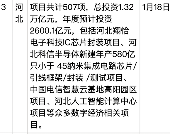 在中部内陆地区,将数字技术与当地实体经济产业结合成为本次开工重大项目的一大特征,智能制造项目众多。以河北省总投资1.32万亿元、年度投资2600亿元的项目为例,其包括了秦皇岛戴卡轻量化汽车底盘零部件智能工厂项目、石药集团智能制造灯塔工厂项目、河北翔恰电子科技IC芯片封装项目、河北科信半导体新建年产580亿只小于 45纳米集成电路芯片/引线框架/封装 /测试项目等众多智能制造相关项目,可见实体经济成为这些地区的出发点,实体产业数字化成为这些地区的一大重点。