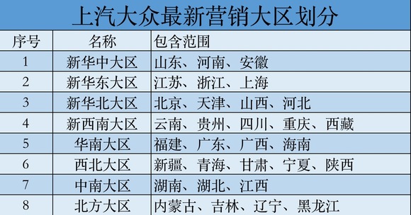 据悉,上汽大众此次撤销了山东、江苏、京津和云贵4个独立营销大区,将其并入新成立的4个营销大区中。其中,山东与河南、安徽组成新华中大区,江苏与浙江、上海组成新华东大区,北京、天津和山西、河北组成新华北大区,云南、贵州和四川、重庆、西藏组成新西南大区。此外,原有的华南、中南、西北和北方大区没有涉及区划层面的调整,保持原样。