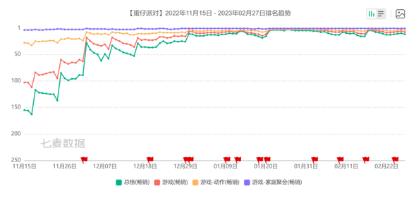 《蛋仔派对》则比较特殊。12月开始,《蛋仔派对》在App Store免费榜和畅销榜上的位置一飞冲天,长时间霸占免费榜第一和畅销榜前十的位置。如果考察这一时段区间不难发现,它和学生的寒假假期是高度重合的。