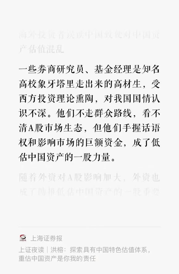 上海证券报最近发布的上海交大高级金融学院MBA导师、上海市科技创业导师洪榕的文章指出,券商研究员,基金经理多是知名高校象牙塔里走出来的高材生,受西方投资理论熏陶,对我国国情认识不深,他们不走群众路线,看不清A股市场生态,但他们手握话语权和影响市场的巨额资金,成了低估中国资产的一股力量。