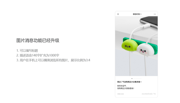 2月下旬,微信更新公众号图文消息功能,创作者最多可以发布9张图片,搭配最多1000字。“组图+小作文”的展现形式与小红书颇为神似,许多人将其戏称为“小绿书”。