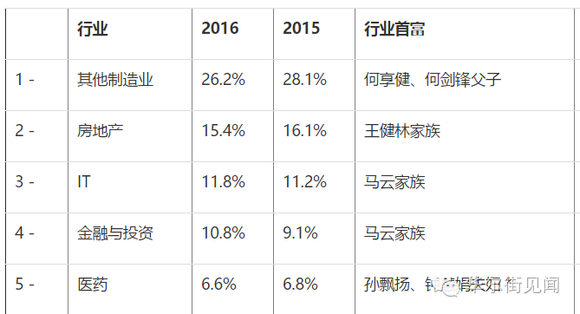 制造业,仍然是最多上榜企业家从事的行业,地产排名第二,IT行业在去年高速增长的基础上继续稳步上升,排名第三。