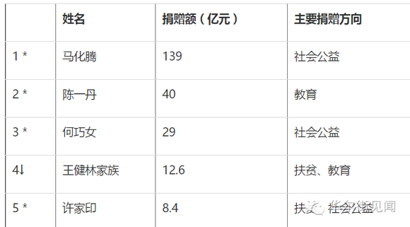 马化腾今年首次成为中国首善,马化腾承诺将捐出一亿股腾讯股票注入正在筹建中的个人公益慈善基金,支持在中国内地为主的医疗、教育、环保等公益慈善项目以及全球前沿科技和基础学科的探索,价值约139亿元;腾讯创始人之一陈一丹捐赠40亿元排名第二,主要捐建武汉学院以及设立教育奖项“一丹奖”;何巧女捐赠自己所持有的东方园林7,630万股股权,价值约29亿元,排名第三,成为中国女首善。