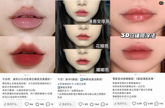 这股流行风潮也吹向了国内。更加自由、自信的新一代Z世代消费者,并没有一味追捧樱桃小嘴,健康与元气才是他们的主要追求。对于厚嘴唇,社媒上的妆教重点从“厚唇改善”转向“画出厚唇”,而薄嘴唇的唇妆也流行往外画。