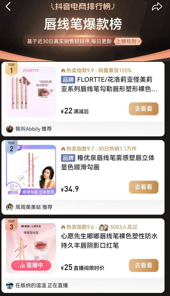 在抖音平台,售价29.9元的花洛莉亚「怪美莉亚系列」唇线笔居“唇线笔爆款榜”第一名,热卖指数达9.9,销量暴涨155%。稚优泉唇线笔排名第二,近30天销售数量达1.1万件。