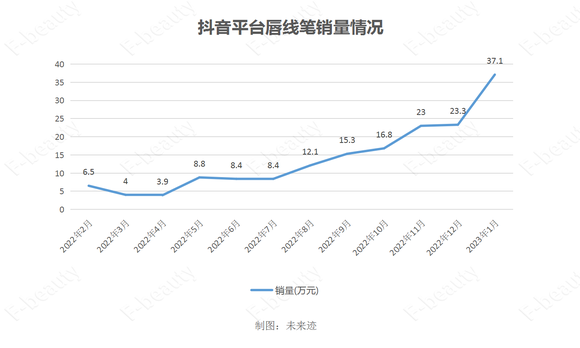 据魔镜市场情报数据显示,2022年抖音平台的唇线笔销量有明显上升趋势。受疫情影响,2022年4月份的唇线笔销售额创下全年最低,此后,唇线笔销量逐渐上升,2022年8月销售额突破12万只并持续上涨。今年1月,唇线笔在抖音平台的月销量已超过37万支。