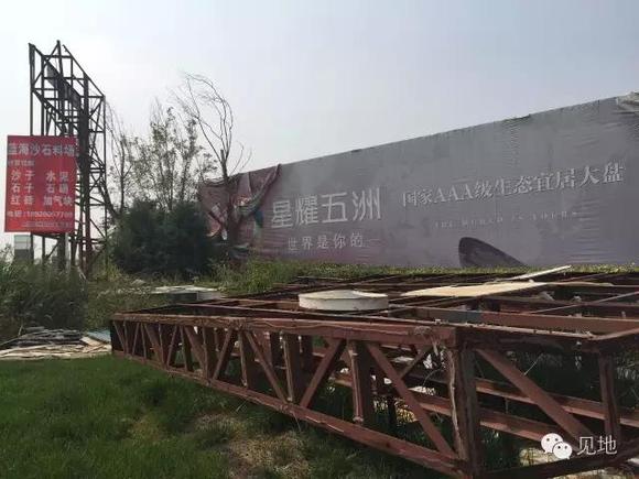 “星耀五洲,世界是你的。”当年豪言壮语,如今已破败不堪。广告牌倒在地上,只剩锈迹斑斑的铁架。小区内沙石料厂的鲜红广告纸,堂而皇之地贴在小区正门入口处。
