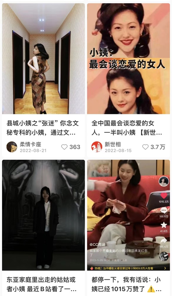 今年年初,一则“不婚主义小姨回家过年”的视频引发关注,美丽的小姨身穿红色大衣,拿出大把压岁钱,举手投足都分外优雅。近两年来,小红书也经常可见与小姨的合照或是“复古小姨穿搭”,还有不少女孩表示自己就是传说中的小姨,过着随心所欲、离经叛道的自由生活。不仅在国内,决定推迟生育、甚至不生育的酷阿姨在国外也很受欢迎,TikTok的#coolaunt标签浏览量有1.4亿。在一段视频中,一名女性推着婴儿车说:“孩子费钱又粘人,我宁愿做个有趣的姨妈,然后就可以把他还给孩子妈,回家美美地睡足八小时啦。”