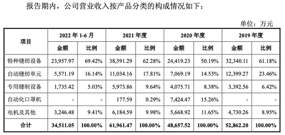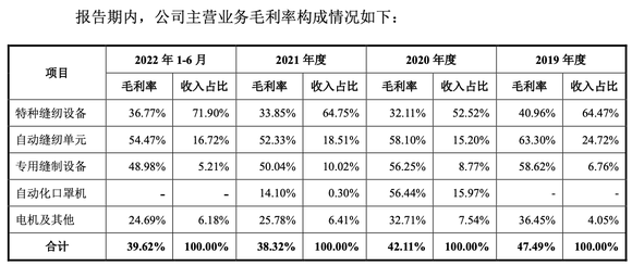 具体来看,报告期内,公司主营业务毛利率分别为47.49%、42.11%、38.32%和39.62%, 2019-2021年逐年下滑,其中贡献收入超一半的特种缝纫设备毛利率降幅达到7.11个百分点,另一大主力产品自动缝纫单元毛利率降幅高达10.97%。