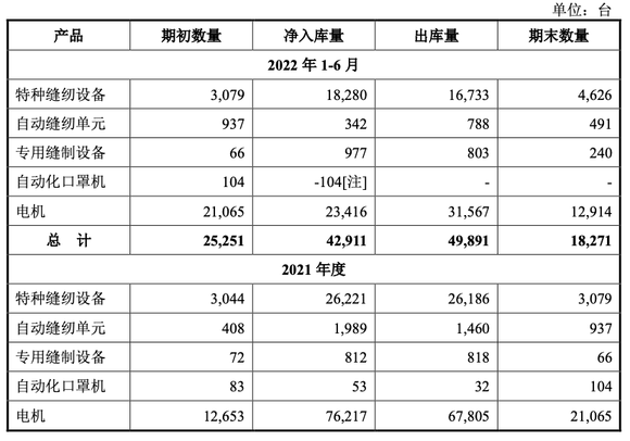 另需关注的是,智能化缝制设备项目并未表明属于公司哪种产品,公司还表示“以生产设备台数为统计指标无法准确衡量生产能力,公司各类产品不适用于传统意义上的“产能”概念”。不过,若以公司报告期内主要产品的期初数量、净入库量、出库量及期末数量作为生产情况的数据,若该项目扩产的是特种缝纫设备,以2021年来看,其净入库量约26221台,出库量为26186台,将扩充产能约一倍。