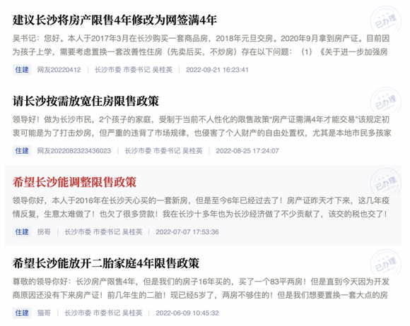 值得注意的是,从去年下半年以来,诸多网友在问政湖南官网留言,呼吁调整二手房限售政策,希望按照网签时间进行交易。对此,长沙市住房和城乡建设局均表示将会同相关部门认真研讨。