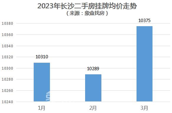 长沙当地房产交易机构象盒找房数据显示,2023年3月,长沙六区一县二手房挂牌均价10374.56元/平,环比增长0.86%,在售房源量有51399套,较上月初净增4000余套。