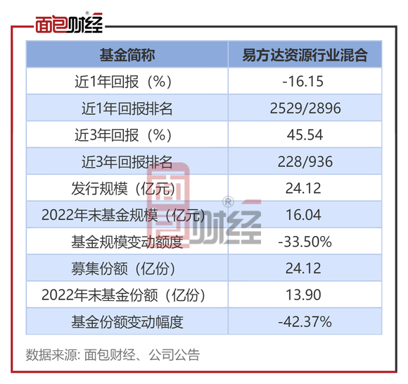 易方达资源行业混合的发行规模约24.12亿元(对应募集份额约24.12亿份)。2022年四季度末,该基金的基金资产净值约为16.04亿元、基金份额总额约为13.90亿份,分别下降约33.50%、42.37%。