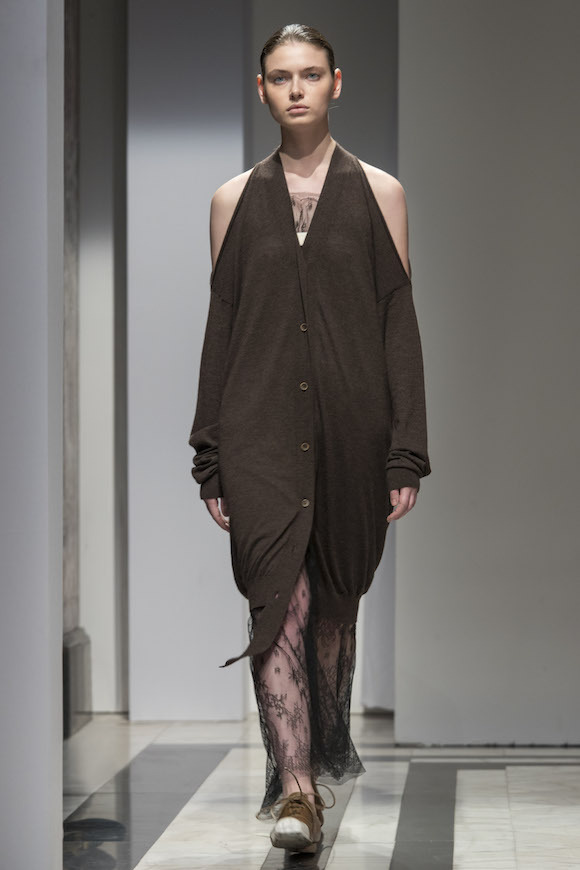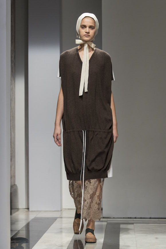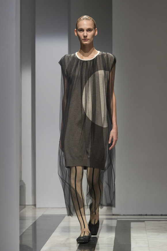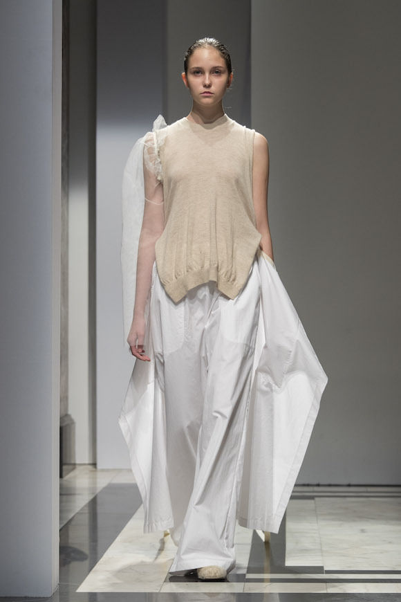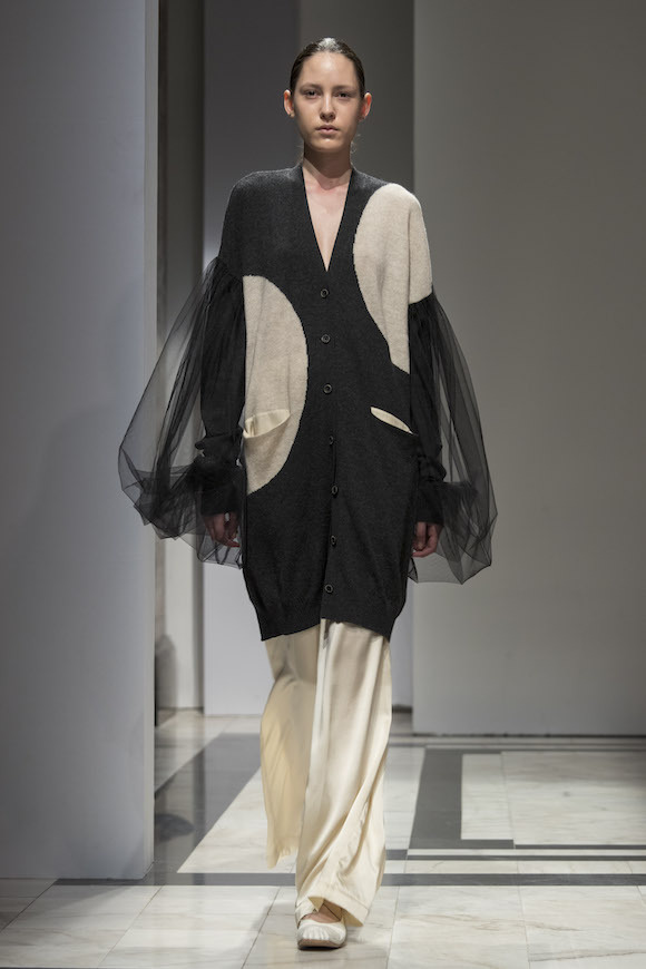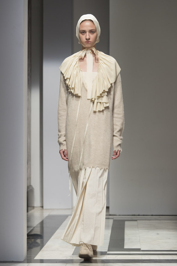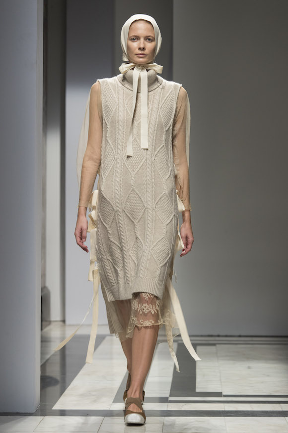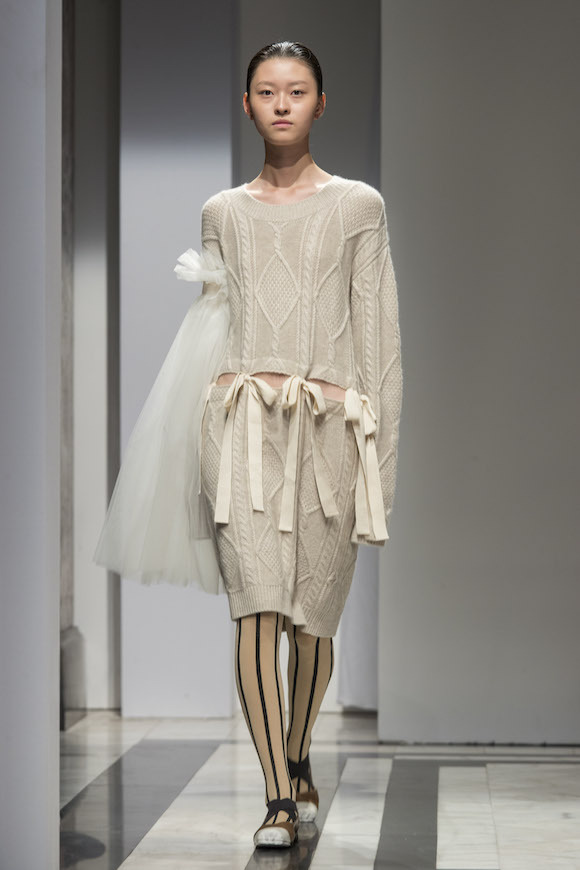 灯光亮起后,模特依次走出,绕场一周后,站上秀场预置的白色阶梯高台。这些裙装有的用羊绒纱线勾出的蕾丝做摆,有的则有羊绒纱布层层叠叠堆出的夸张衣袖,有的胸前、腰间开出羊绒纱布做出的花......“我们将网纱和羊绒这两种似乎是两个极端的材料相组合,发现了一种意想不到的对比及碰撞。”王汁在接受Labelhood采访时说。同时,也有部分模特穿着羊绒织片和真丝、棉布等面料拼接做成的裙装。“我们希望由此来唤起人们记忆中羊绒最传统的面貌,同时又提供无数新的可能性。”