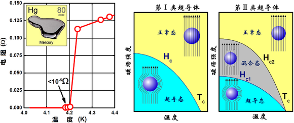 超导材料对外界磁场有不同响应,可以简单分为两类。绝大部分超导体属于第二类,它们在某些磁场-温度区间(称之为“混合态”)体现出“部分抗磁性”(即磁化率不到-1),仅在很低温度且很弱磁场下才会有“完全抗磁性”,所以在很多情况下验证超导电性的存在,并不一定要求χ=-1(尽管此时才能被称为“超导态”),但必须独立测量到足够强的抗磁信号(χ为负值)。对于这类超导体而言,即使在部分抗磁的混合态下,其零电阻效应也能够保持住,直到磁场足够强达到上临界场时,才会彻底被破坏恢复到有电阻的“正常态”(图1右),所以是否具有完全抗磁状态,对超导体在零电阻状态下的应用影响不大。