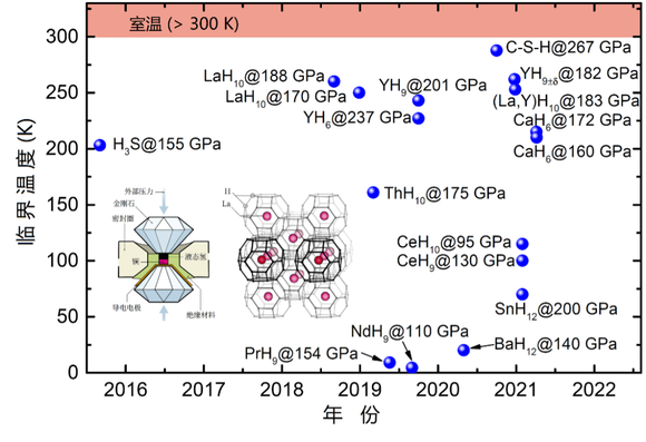 目前,常压下的超导临界温度记录,是1993年发现的Hg-Ba-Ca-Cu-O体系, 超导临界温度Tc为134 K,该材料在高压下的Tc可提升到165 K(图2)[4]。人们还尝试把元素周期表的单质几乎都压了一遍,普遍发现Tc可进一步提升,比如单质Ca的Tc在高压下可以达到29K,远超常压下的单质Tc记录(即Nb的Tc=9 K)[5]。因此高压是提高超导温度的重要途径,也是探索室温超导的最佳方案之一。需要特别指出的是,于物理学家而言,室温是有明确定义的,即300K,约相当于27℃。实际生活中比较舒适的 “室温” 大致是15℃-25℃,也就是北方冬天供暖标准,和夏天空调建议温度。