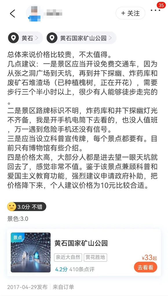 至于在双方交接之前的运营情况,以携程平台的点评数据为例,围绕性价比、交通配套、管理维护、服务缺位等问题在内,黄石国家矿坑公园的用户评价差强人意(需指出的是,汇总用户点评,自黄石文旅集团接手后,黄石国家矿坑公园的运营态势似乎并未呈现明显逆转)。