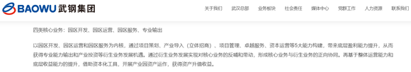 武钢集团官网则显示,目前武钢集团经营园区开发、园区运营、园区服务、专业输出四类核心业务,具体而言,武钢集团以园区开发、园区运营和园区服务为内核,通过项目策划、产业导入(立体招商)、项目管理、卓越服务、资本运营等5大能力构建,带来底层盈利能力提升,从而获得专业能力输出和产业投资等衍生业务发展机遇。通过衍生业务发展实现对核心业务的反哺和带动,形成核心业务与衍生业务的正向协同。再基于整体运营能力和底层收益能力的提升,借助资本化工具,开展产业园资产运作,获得资产升值收益。