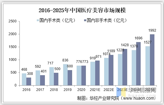 据华经产业研究院数据显示,我国2016-2020年医美市场规模自人民币776亿元增至人民币1549亿元,CAGR达18.9%,预计2025年达到3519亿元。按分类看,2020年我国非手术类/手术类医美市场规模分别为773/776亿元,非手术类医美占比49.9%,预计2025年我国非手术类/手术类医美市场可达1527/1992亿元。