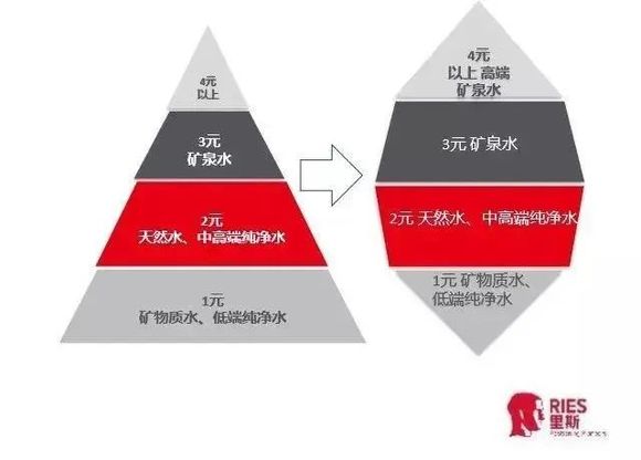 按照里斯咨询预判结果显示,中国瓶装水消费市场的格局,将从金字塔型向纺锤型演变,即: