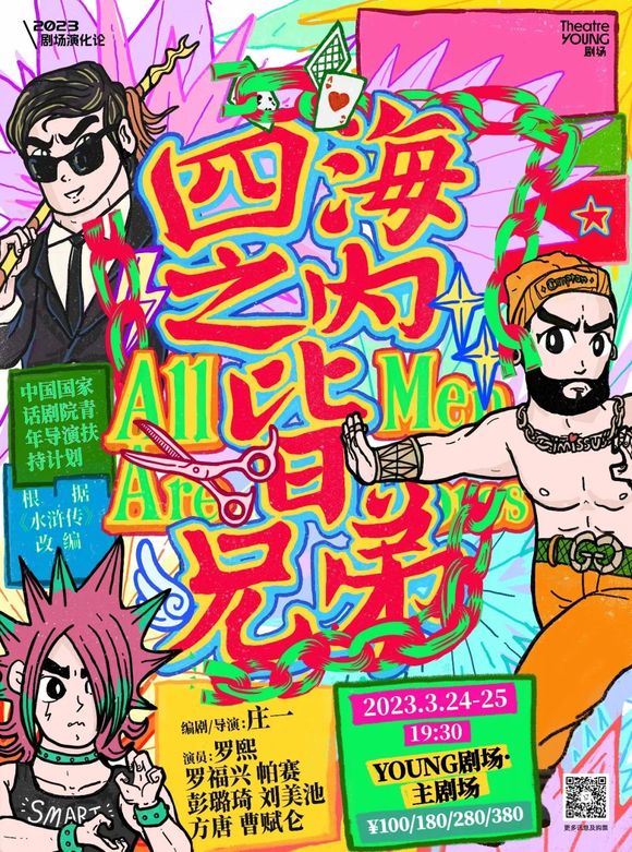话剧《四海之内皆兄弟》是中国国家话剧院主办的“青年导演创作扶持计划”中改编《水浒传》的第一部作品,剧名出自赛珍珠所译《水浒传》的英文书名“All Men Are Brothers”,其所指或许不单是世间情义,还有人类在命运面前悲壮的相似性。在本剧中,虚构与现实相互交织——“杀马特”教主罗福兴和北京人艺话剧演员罗熙在剧中分饰两角,他们与开心麻花音乐剧演员帕赛及其他演员一起重新演绎水浒故事,也讲述他们自己的真实人生。罗福兴饰演的“史进”象征着一种充满天真“我命由我不由天”的豪侠之气的人,却迎来被现实毁灭的结局;罗熙饰演的“林冲”则是一个典型的工薪阶层,看似体面却难以应对生活中的任何风吹草动,只有在被逼入绝境才能燃起一丝反抗的勇气。全剧唯一没有现实对应的角色是帕赛饰演的鲁智深。他是导演庄一最喜欢的一个理想人物,他活得通透,有大智慧,其反抗精神的出发点不是自己,而是公理。