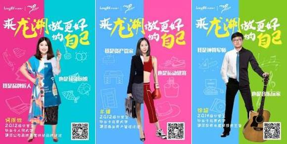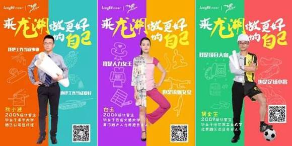 龙湖仕官生校招系列海报色彩艳丽、跳跃,是加分创意;海报上历年仕官生精英被背景色分为两半,左边严肃干练的工作形象和右边活泼个性的生活状态融于一身、毫无违和,与万科的同类海报技法相似但更巧妙。另外,海报人物男女各半,同样是性别尊重的体现。