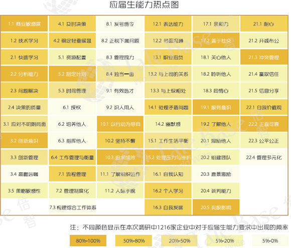 倍智人才研究院就企业在校园招聘中如何选对、留住、用好人才的问题,对10个行业的1216家企业进行了调研,并分析了倍智数据库中近70万应届生的测评数据,发布了《2016年应届生能力画像白皮书》。报告显示,企业在校招中最关注的能力有12项,其中7项与任务执行有关,5项与人际互动相关;创新意识成为排名第4的能力要求,一定程度上也反映出参与调研的企业在新竞争环境下,希望通过新鲜血液推动创新的意愿。