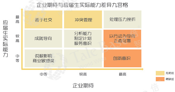 实际上,企业的期待能力与应届求职者本身的能力分布并不能良好匹配。如果将稀缺能力的定义为企业要求高,但应届生实际水平低的能力;把企业要求低,应届生实际水平高的能力定义为充裕能力的话,从上图可以看出,创新意识、以行动为导向、正直可靠是2016年度应届生最稀缺的3项能力。尽管应届生给大家的感觉是非常有活力,喜欢尝试,但这并不意味着它们的创新意识很高,数据表明它们可能喜欢新事物,但真正能独立思考、拥有开创意识的人并不多;此外,稀缺以行动为导向和正直可靠,说明应届生中想法多于实干,真正沉下心踏实肯干的人少。