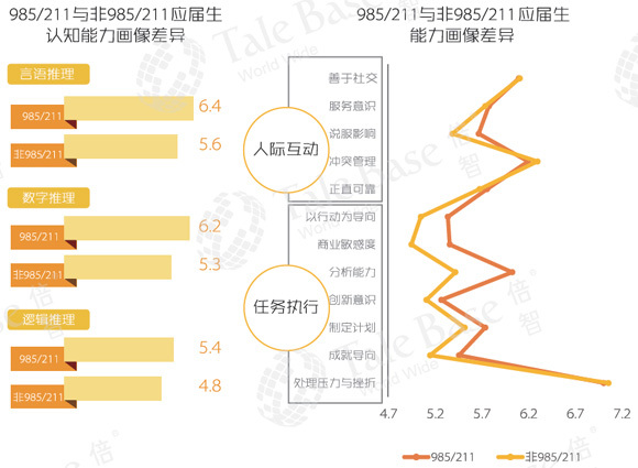 985/211院校与普通院校应届生能力差异主要体现在任务执行和认知能力上,985/211大学学生这两项更胜一筹,而人际互动上两者不存在显著差异。一般企业在应届生进入初期,都会安排偏事务性工作让他们快速熟悉岗位工作内容。名校学生在任务执行上的能力较有优势,因此更能适应工作要求及相关规定。反之,与人打交道为主的岗位,如销售、客服、物业管理等,并不特别需要名校生。