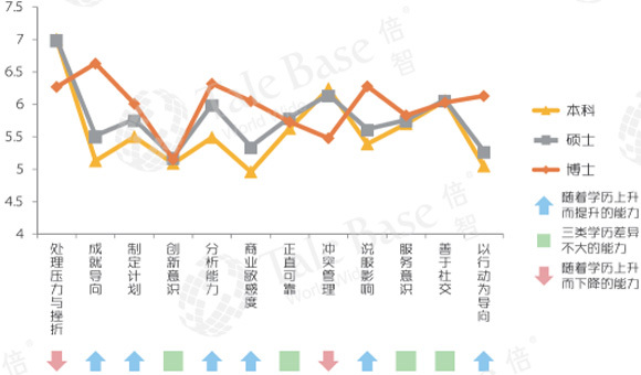 数据显示,认知能力、任务执行相关能力随学历提升而提高;人际互动相关能力与学历关系不大;处理压力与挫折及冲突管理能力,博士生反而比本科生、硕士得分更低。