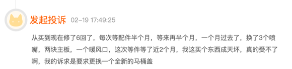 陈先生遭遇的质量问题则更加直接,他投诉称自己购买的箭牌智能卫浴马桶盖从购买之后到今年2月,已经陆续维修了6次,包括3个喷嘴、2块主板和1个暖风口、每次等配件到维修要1-2个月时间:“1300多元的马桶盖总是坏,真的受不了,诉求是要更换一个全新的马桶盖。”