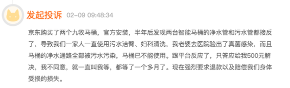 消费者赵先生投诉称,自己去年在京东花了6000多元购买了两个九牧智能马桶,并由官方人员安装:“然而过了半年之后才发现两台智能马桶的净水管和污水管都接反了。”赵先生表示,不仅由于净水马桶净水通路被污水污染,不能再使用了,家人还在医院检查出真菌感染,危害健康。