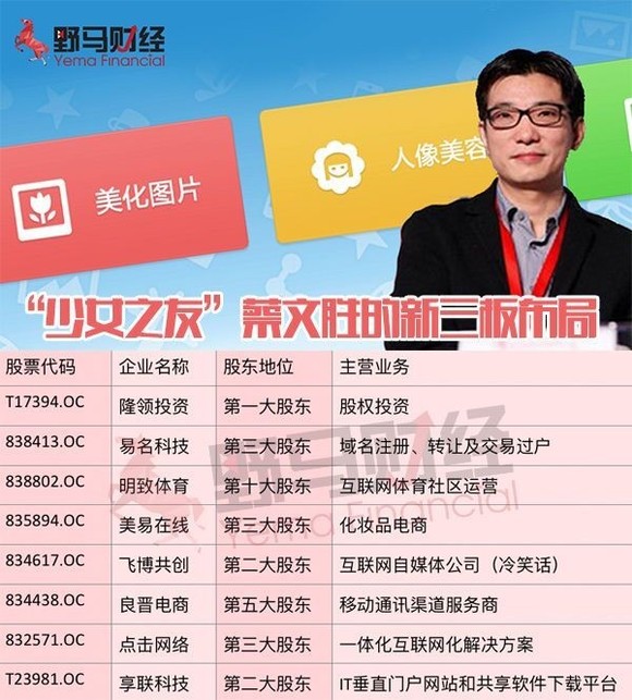 而美图秀秀董事长蔡文胜,在给万千少女带去美颜的同时,也为自己收获了财富。据野马财经不完全统计,蔡文胜共计投资暴风科技(300431.SZ)、云游控股(00484.HK)、飞鱼科技(01022.HK)、58同城(WUBA.N)等多家上市公司,易名科技(838413.OC)、明致体育(838802.OC)、美易在线(835894.OC)等6家新三板挂牌企业,此外,美图秀秀也于最近传出赴港上市消息。