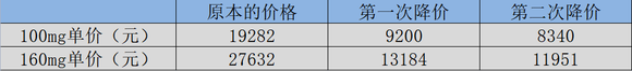 连续两次降价后,100mg规格的T药单支价格已经降至8340元,较19282元的原价骤降56.7%,单支价格就下降了1万元以上。若以50kg体重计算,那么T药降价前患者一年需要支付约48万,而降价后则仅约20万元,患者负担大幅下降。如果后续T药顺利进入医保,那么它的价格有望进一步下降,患者单年负担甚至有望跌破20万。
