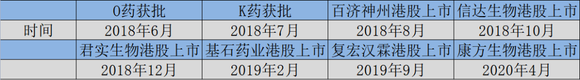 最为典型的例子就是PD-1药物,在明星药物O药和K药进入中国之前,百济神州想要融资则只能依靠美股市场。可在O药与K药分别在2018年6月和7月登陆中国市场后,近半年时间内,中国主流的PD-1企业百济神州、信达生物、君实生物就先后登陆港股市场,基石药业、复宏汉霖、康方生物等二线PD-1创新药公司也在2019年和2020年完成上市。