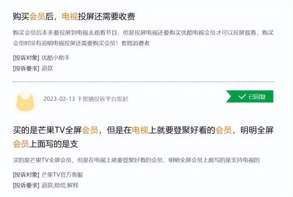 图/黑猫投诉上与电视会员相关的投诉信息 来源/黑猫投诉 燃次元截图