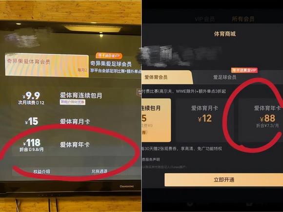 图/爱奇艺电视端体育会员与APP端体育会员价格对比 (左为电视端价格,右为APP端价格) 来源/燃次元拍摄