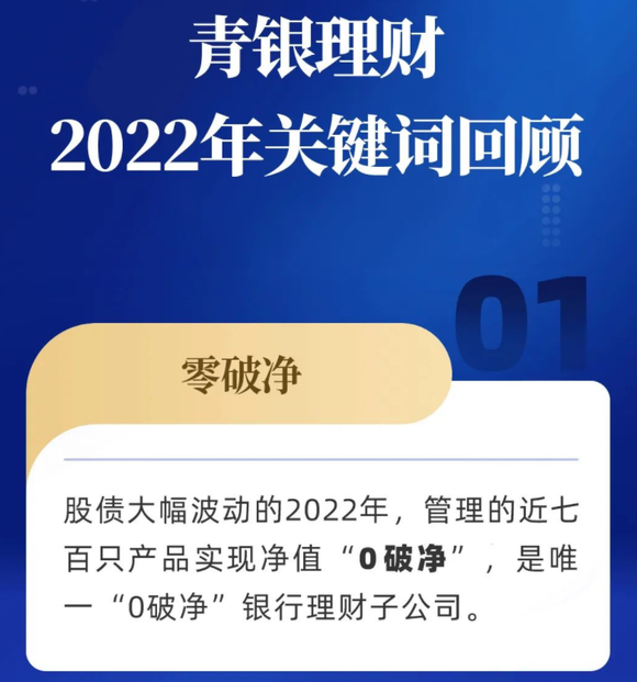 其在2022年12月的投资者关系活动记录表中表示,其发行的理财产品净值表现稳定,截至当前理财产品零破净。在其发布的《青银理财2022年关键词回顾》中,“零破净”也是排在第一位的关键词。