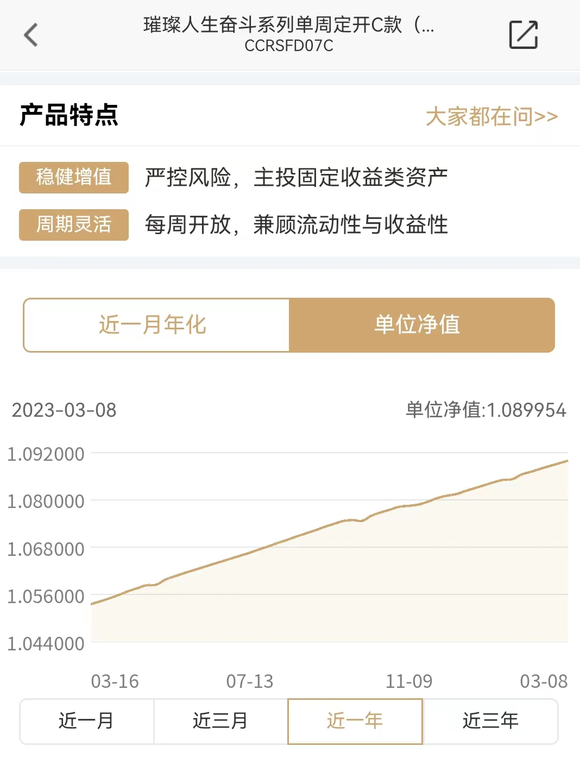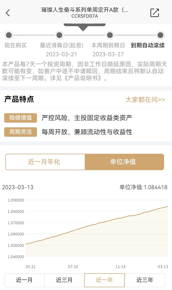 在青银理财APP上搜索相关产品,其中璀璨人生奋斗系列单周定开A款、C款和F的近一年净值曲线皆为较平滑的曲线。