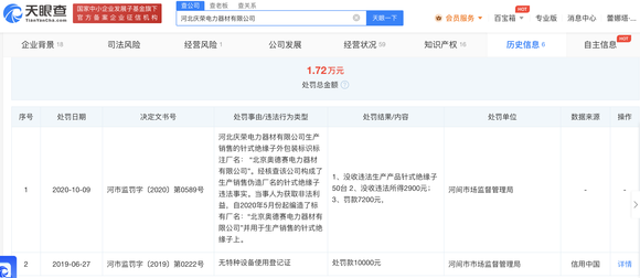 天眼查显示,2020年10月,庆荣公司曾因生产、销售伪造或者冒用他人厂名、厂址的产品,被河间市市场监督管理局行政处罚6300元,并没收非法财物。