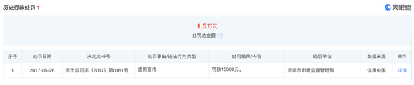 历史行政处罚中,明发公司在2017年还因虚假宣传被罚1.5万元。