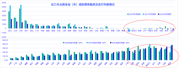 据中诚信统计,2020年-2022年,天津、黑龙江、青海、辽宁、内蒙古、吉林、云南、贵州和甘肃等9个省(区、市)的城投债净融资额整体表现较差。