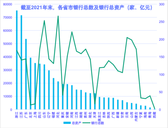 根据中诚信统计,截至2021年末,黑龙江、吉林、陕西、广西、新疆、甘肃、云南、山西、内蒙古、宁夏、海南、青海和西藏等13个省(区)的银行总资产不超过1万亿元,金融资源较为匮乏,与此相对,浙江和江苏的银行总资产超过7万亿元,是上述地区的7倍,处于全国领先地位。