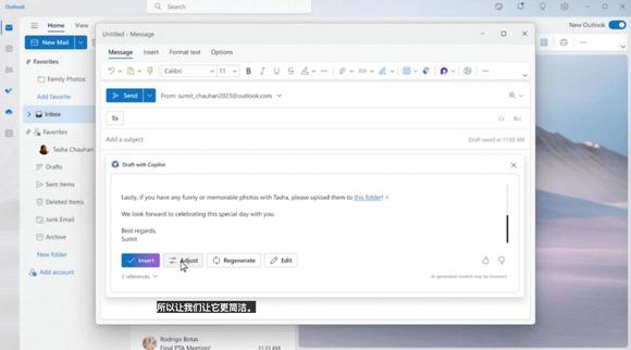 Copilot还可以自动起草回复,甚至联动使用Excel文件中的数据。你通过简单操作编辑生成的内容,让它更简洁,还可以更改写作内容或添加更多上下文。最后,你只需查看建议的响应,然后点击发送。